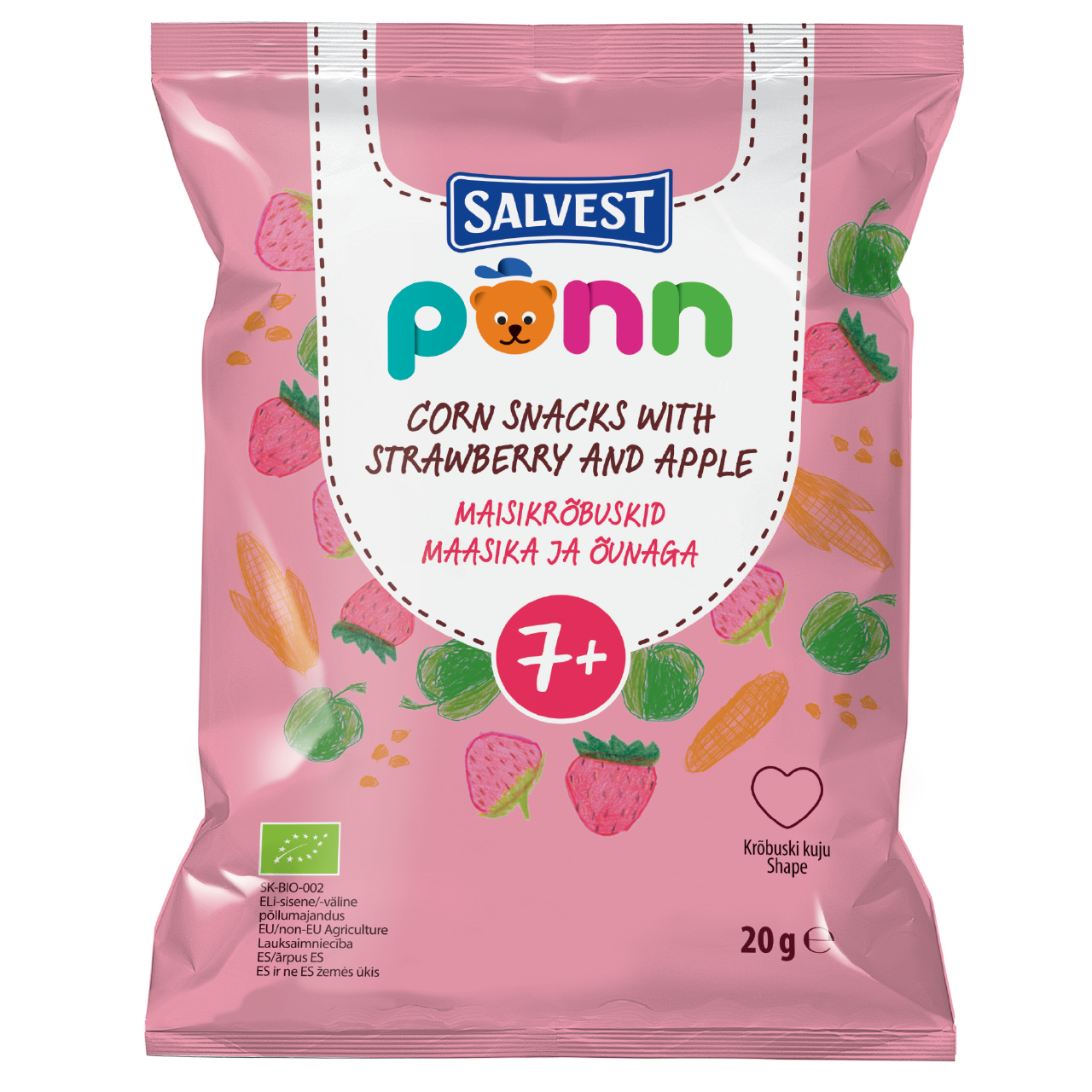 Põnn Organic corn snack are a healthy and mild-tasting snack for babies from 7 months onwards and they are sure to be enjoyed by older children as well. The heart-shaped organic corn puffs with strawberry and apple have a pleasantly sweet flavor. They are easy for the baby to hold, promoting motor skills development.
