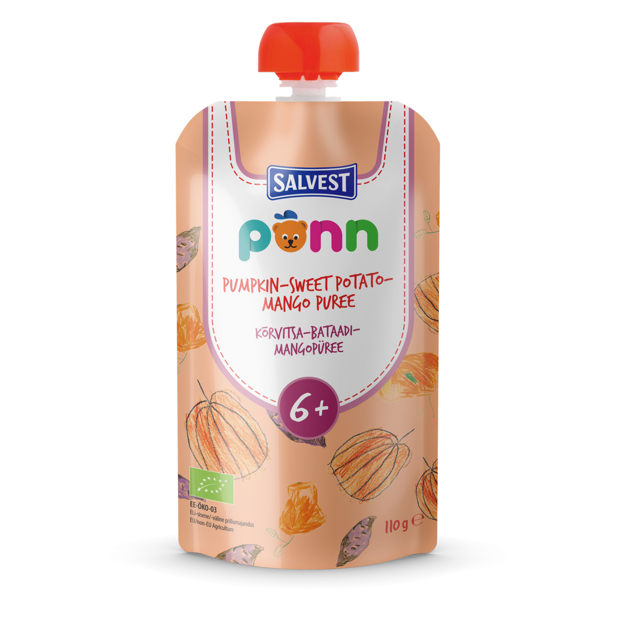 Põnn Organic Pumpkin-sweet potato-mango puree is a baby food in a convenient package and with a silky consistency. The use of different vegetables makes this dish versatile, offering new taste experiences for your baby. The product is made of vegetables, pumpkin and sweet potato, while high-quality mango puree adds a touch of sweetness. Recommended for infants after 6 months of age.